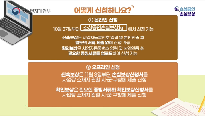 온라인 신청이 어려운 소상공인들은 오프라인 신청도 가능하다. 11월 3일부터 사업장 소재지 내 가까운 시·군·구청에 마련된 손실보상 전용 창구를 방문해 신청하면 된다.