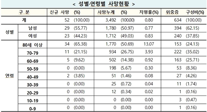 사망자 52명 중 60대 이상 고령층은 50명(80세 이상 34명, 70대 11명, 60대 5명)이었고 40대에서 2명이 숨졌다.