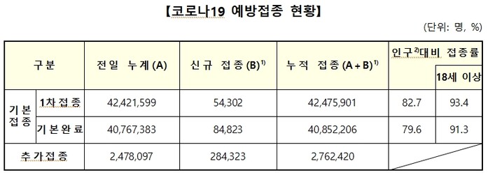 인구 대비 1차 접종률은 82.7%, 기본완료접종률은 79.6%를 기록했고, 18세 이상 1차 접종률은 93.4%, 기본완료접종률은 91.3%다.