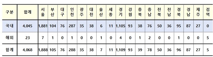 중앙방역대책본부(방대본)는 27일 0시 기준으로 국내발생(이하 지역발생) 신규 확진자가 4045명, 해외유입 사례가 23명 확인되면서 신규 확진자가 4068명으로 집계됐다고 밝혔다. 지금까지 누적 확진자 수는 43만6968명으로 증가했고 해외유입 누적은 1만5637명이 됐다.