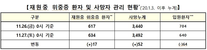 27일 0시 기준 전국 위중증 환자 수는 전날보다 17명이 늘어난 634명으로 집계됐으며 사흘 연속 600명대를 기록했다.