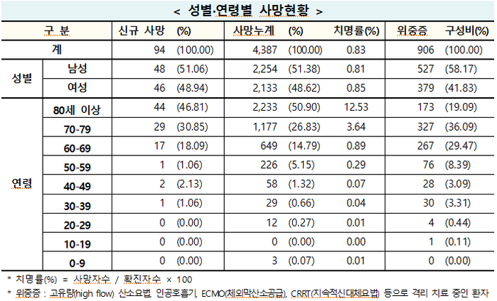 누적 사망자 4387명·치명률 0.83%...위중증 하루새 30명 증가