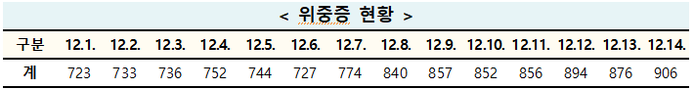 위중증 환자 수도 하루 사이에 30명이나 증가하며 906명이 됐다. 직전 최다였던 12일의 894명을 이틀만에 뛰어넘어 또다시 최다치를 경신했다.