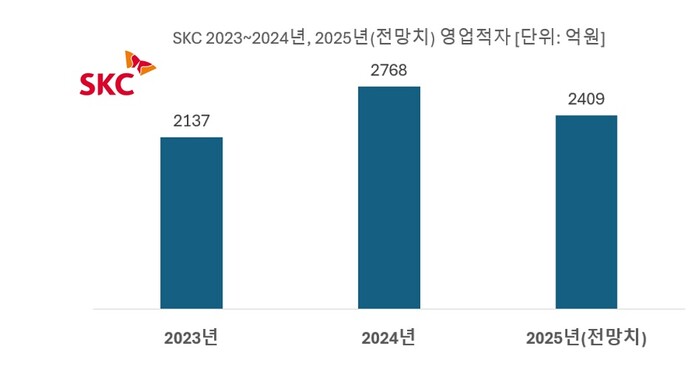 금융감독원 전자공시시스템에 따르면 SKC는 2023년 영업적자 약 2137억원, 지난해 2768억원 수준의 손실을 봤다. 금융정보업체 애프앤가이드에 따르면 올해 전망치는 2409억원의 영업적자를 기록해 3년 연속 적자로 관측된다.