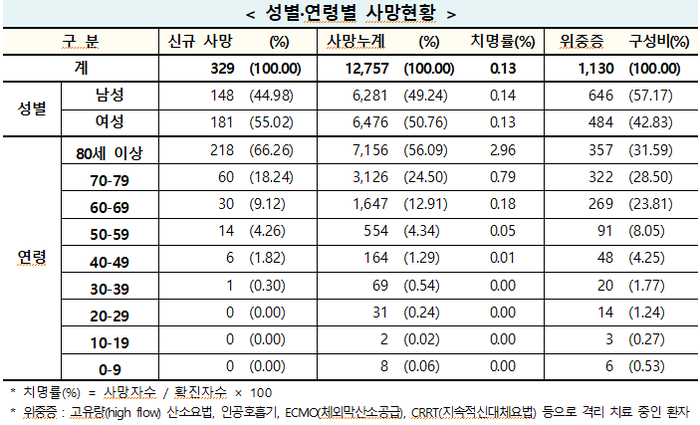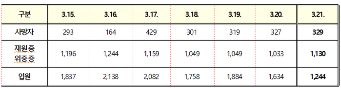 확진자는 감소세를 보이고 있지만 사망자와 위중증 환자 수는 여전히 고공행진이다. 전날 사망자는 329명으로, 직전일보다 2명이 더 많으며 역대 두 번째 하루 최다를 기록했다.