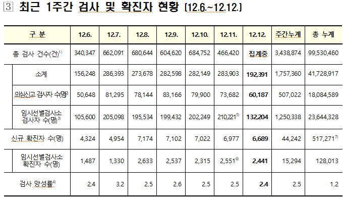 중앙방역대책본부(방대본)는 12일 0시 기준으로 코로나19 신규 확진자가 6689명 확인돼 지금까지 누적 확진자는 51만7271명으로 집계됐다고 밝혔다. 이중 해외유입 누적 확진자는 1만6070명이다.