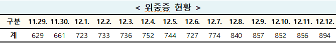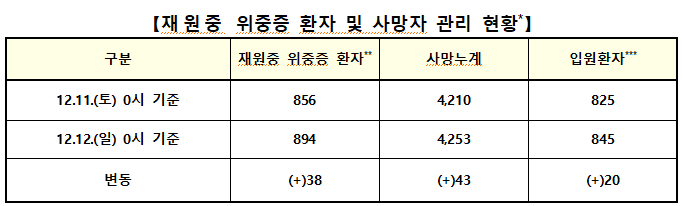 ▲ 12일 0시 기준 코로나19 위중증 환자 및 사망자 관리 현황. [중앙방역대책본부 제공] |