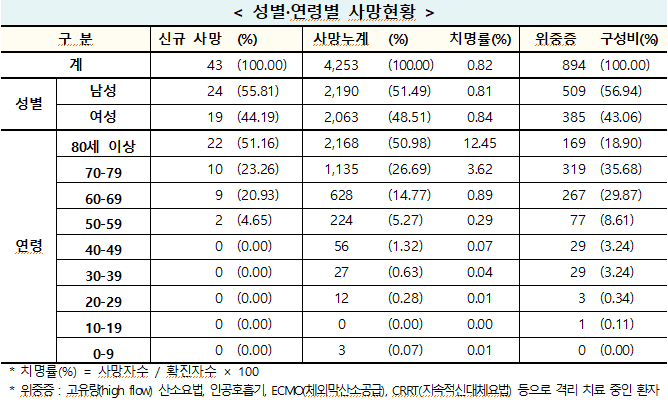 전날 역대 최다(80명)를 기록했던 사망자는 이날도 43명이 나왔다. 누적 사망자는 4253명이고 평균 치명률은 0.82%다.