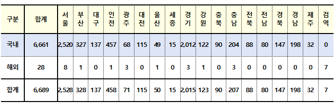 이날 전체 신규 확진자 중 국내감염(지역발생)은 6661명이고 해외유입은 28명이다. 전국 17개 시도에서 모두 확진자가 나왔다.