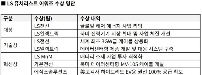 대상은 ▲ LS전선의 글로벌 해저 에너지 사업 리딩 ▲ LS일렉트릭의 북미 전력기기 시장 확대 및 사업 체질 개선 등을 주도한 팀이 수상했다.