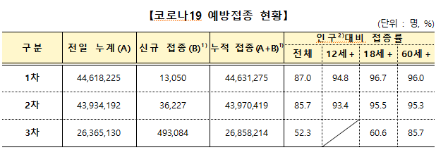 코로나19 백신 접종 완료율(2차까지 기본접종을 마친 비율)은 이날 0시 기준 85.7%(누적 4463만1275명)다. 12세 이상은 93.4%, 18세 이상은 95.5%, 60세 이상은 95.3%이다.