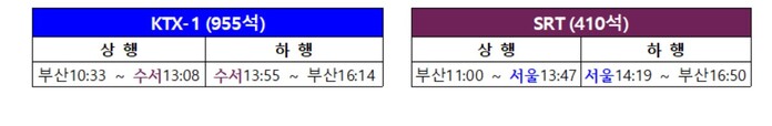 KTX는 수서역⇔부산역을, SRT은 서울역⇔부산역을 매일 각 1회 왕복 운행할 계획이며, 예매가 어려웠던 수서역에 SRT(410석) 대비 좌석수가 2배 이상인 KTX-1(955석)을 투입해 수서역 이용객의 좌석 선택 폭이 넓어질 것으로 기대된다.