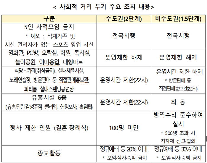 ▲ 사회적 거리두기 주요 조치 내용. [출처= 중앙재난안전대책본부] |