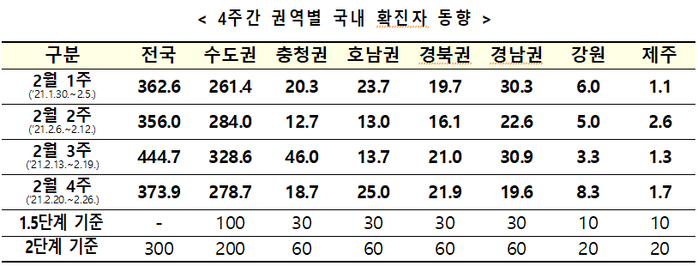 ▲ 최근 4주간 권역별 국내 확진자 동향. [출처= 중앙재난안전대책본부] |