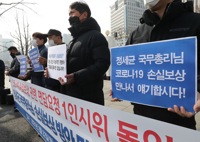 ▲ 중소상인과 실내체육시설 단체 회원들이 지난 22일 정부서울청사 앞에서 코로나19 거리두기 관련 재난지원금이 아닌 손실보상을 촉구하는 기자회견을 하고 있다. [서울= 연합뉴스] |