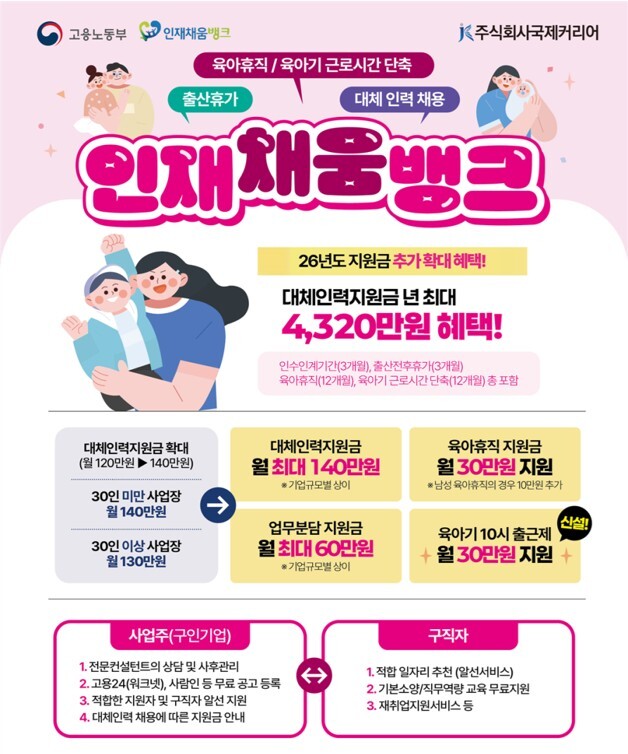 한편 인재채움뱅크는 기업의 인력 공백 해소와 구직자 취업 지원을 위해 대체인력 채용지원, 구직자 알선, 고용서비스 제공 등 다양한 취업지원 서비스를 운영하고 있다.