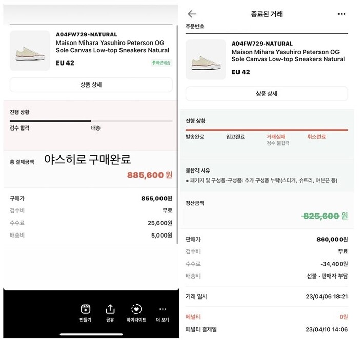 ▲ A 씨가 크림에서 구매할 땐 검수에 합격했던 해당 제품이 다시 크림에 판매할 땐 검수 불합격 처리됐다고 주장하며 올린 거래 내역 [온라인 커뮤니티 캡처] |