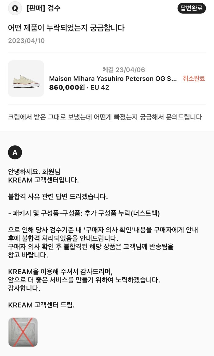 이러한 문의에 크림은 "추가 구성품 더스트백의 누락으로 구매자에게 안내 후 불합격 처리됐음을 안내드린다"고 답했다.