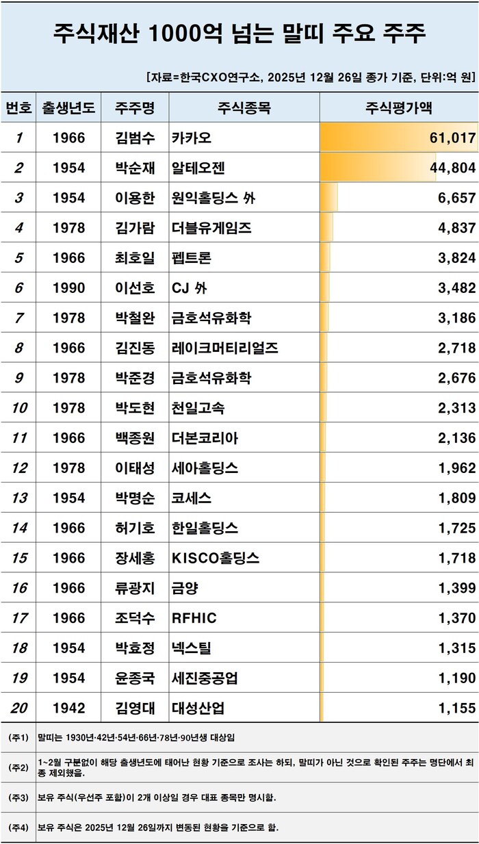 이어 이용한 원익그룹 회장(1954년생·6657억 원)이 말띠 출생 대기업집단 총수로 분류됐다. 주식평가액 2000억 원 이상 보유자에는 김가람 더블유게임즈 대표, 최호일 펩트론 대표, 이선호 CJ 경영리더, 박철완 전 금호석유화학 상무, 김진동 레이크머티리얼즈 대표, 박준경 금호석유화학 사장, 박도현 천일고속 대표, 백종원 더본코리아 대표 등이 포함됐다.