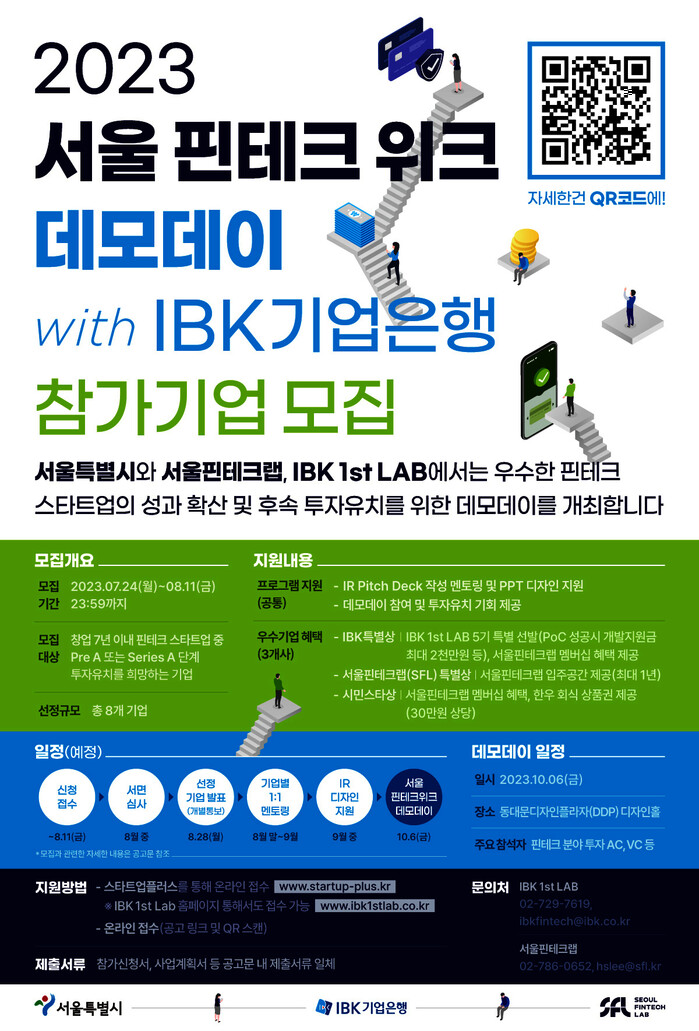 ▲IBK기업은행이 오는 10월6일 서울 DDP(동대문 디자인 플라자)에서 열릴 ‘2023 서울 핀테크 위크 데모데이 with IBK기업은행’에 참여할 핀테크 기업을 모집한다. [사진=IBK기업은행] |