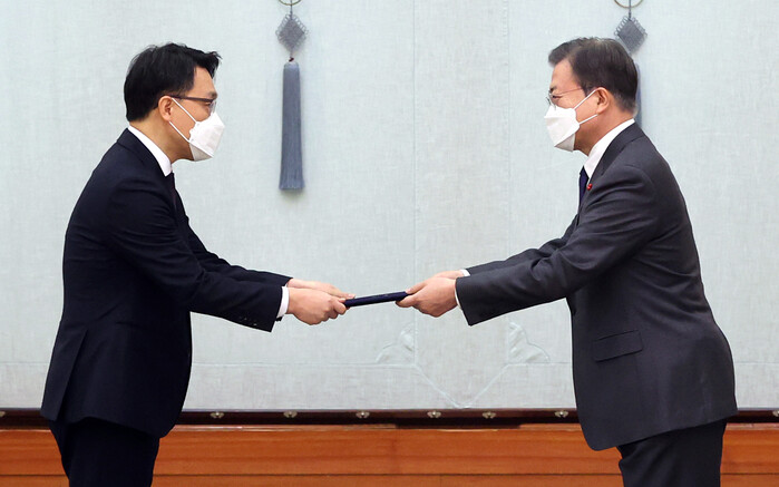 | ▲ 문재인 대통령이 21일 오전 청와대에서 김진욱 초대 고위공직자범죄수사처장에게 임명장을 수여하고 있다. [사진= 연합뉴스] |
