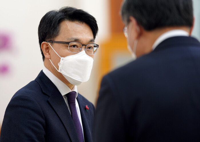 | ▲ 김진욱 초대 고위공직자범죄수사처장이 21일 청와대에서 열린 임명장 수여식에 참석해 신현수 민정수석과 인사하고 있다. [사진= 연합뉴스] |