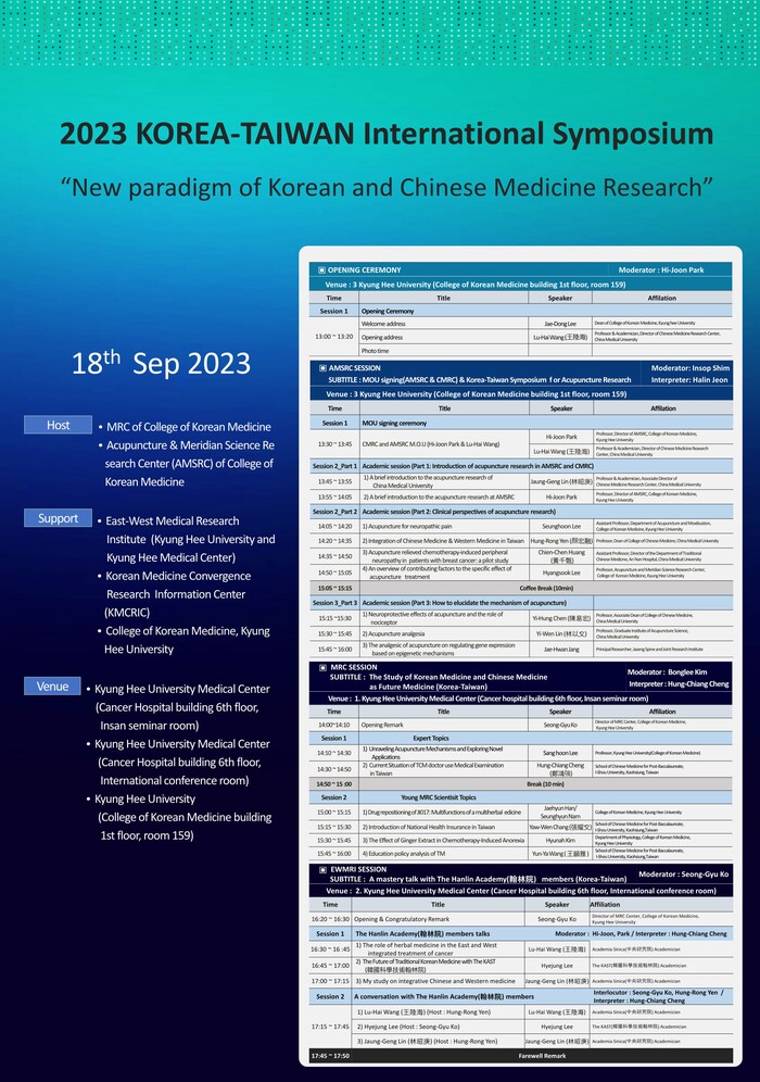 총 3개의 세션으로 구성된 이날 심포지엄에서 첫 번째 세션은 “MOU signing(AMSRC & CMRC) & Korea-Taiwan Symposium for Acupuncture Research”을 주제로 경희대학교 침구경락융합연구센터와 대만 중국의약대학 중의약리서치센터는 MOU를 맺고 각 양 기관과의 협력 및 교류 강화를 논의하며 침구분야에 대해 전문적인 학술교류를 가졌다.