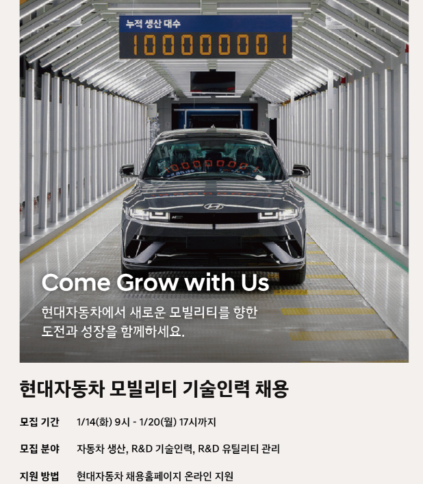 현대차는 “공정하고 투명한 절차 아래 채용을 진행할 계획이다”라며 “다양한 개성과 역량을 가진 인재를 적극적으로 확보할 것”이라고 밝혔다.