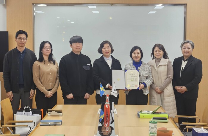 | ▲ 이정원 서울사이버대 군교육지원센터 부총장(좌측에서 다섯 번째)와 정수연 국방애드 대표(좌측에서 네 번째)를 포함한 관계자들이 국방부장관 감사장 전달식 후 기념사진을 찍고 있다. [사진=서울사이버대학교] |