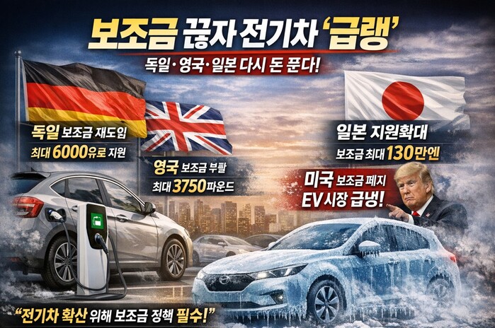 독일은 2023년 말 예산 위기를 이유로 전기차 보조금을 전격 조기 종료했다가 이듬해 전기차 판매가 27.4% 급감하는 충격을 겪었다. 유럽 최대 전기차 시장이라는 타이틀마저 영국에 빼앗겼다. 결국 독일 정부는 2026년 1월 보조금 제도를 재도입했다. 가구 소득 8만 유로(약 1억 4,000만 원) 이하 소비자에게 최소 3,000유로(약 520만 원)에서 최대 6,000유로(약 1,040만 원)를 지원한다.