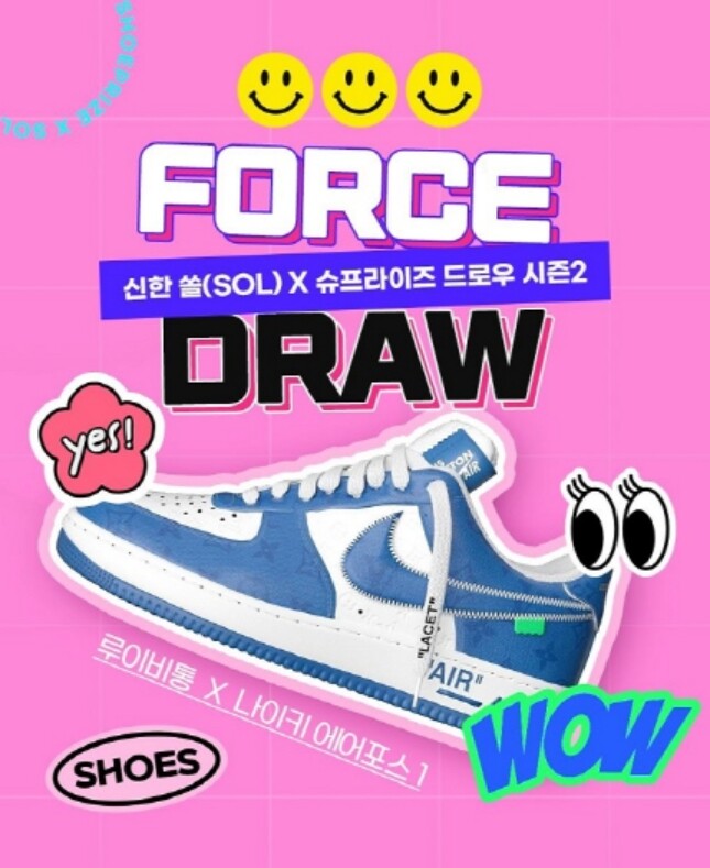 신한은행이 슈프라이즈와 한정판 '루이비통 X 나이키 에어포스 신발' 등을 추첨 통해 제공하는 이벤트를 실시한다. 신한 쏠(SOL) 고객이라면 7월 13일까지 쏠(SOL)에서 응모가 가능하다.