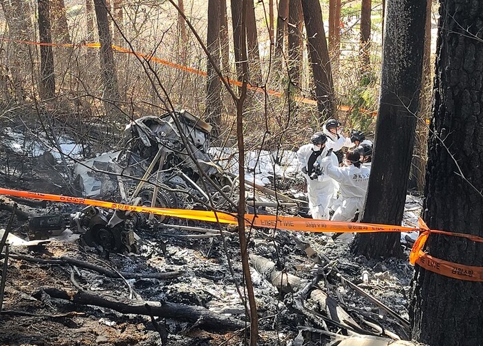 당초 기장 A(71)씨와 정비사 B(54)씨 등 탑승자 2명이 탑승했다고 알려진 것과 달리 인명피해가 5명으로 확인되면서 산림 당국도 신원 확인에 나섰다.