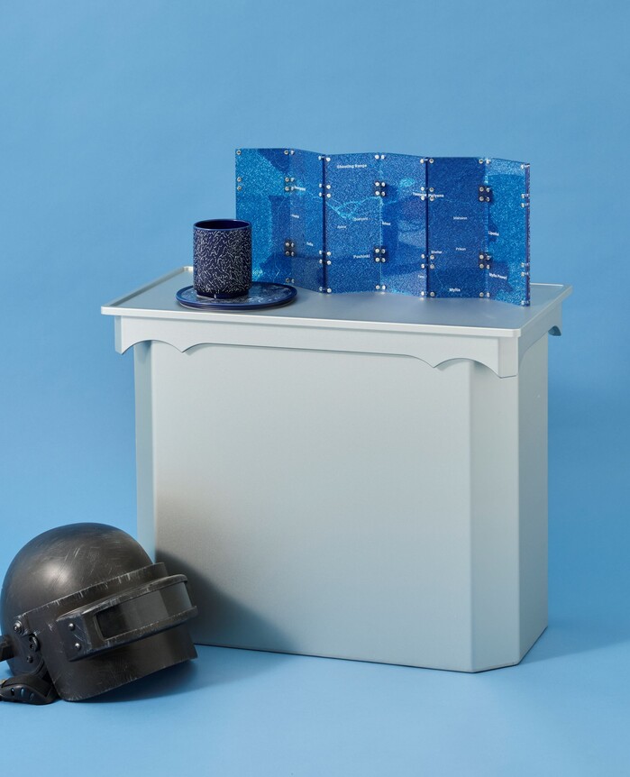 슈퍼포지션과의 협업에서는 배틀그라운드 게임 내 상징적인 공간인 ‘블루존’을 한국 전통 자개에서 착안한 ‘디지털 자개’ 개념으로 재해석했다. 게임 속에서 긴장과 전략을 상징하는 블루존을 병풍이라는 전통 오브제로 구현해, 디지털 세계의 이미지를 오프라인 예술 작품으로 시각화했다. 주요 상품으로는 ‘펍지 블루존 병풍’과 ‘블루존 오브젝트 컵·접시 세트’가 있다.