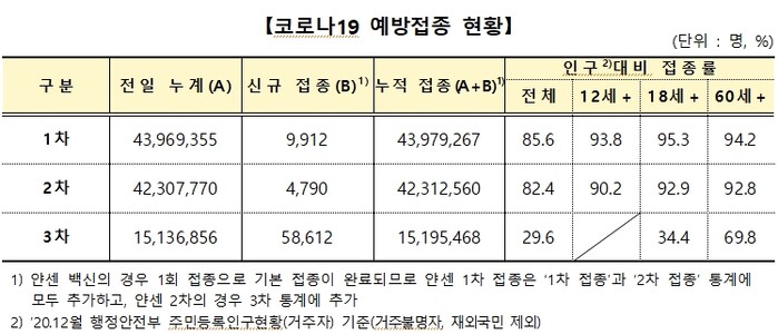 코로나19 예방접종대응추진단에 따르면, 26일 0시 기준으로 인구 대비 1차 접종률은 85.6%, 2차 접종률은 82.4%, 3차 접종률은 29.6%로 집계됐다.