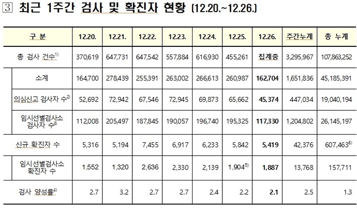 ▲ 26일 0시 기준 코로나19 최근 1주간 검사 및 확진자 현황. [중앙방역대책본부 제공] |