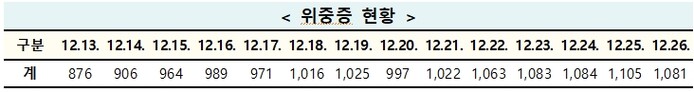위중증 환자는 1081명으로 전날보다 24명이 줄었다. 하지만 지난 21일부터 엿새 연속 1000명대를 넘었다. 그간의 추이를 보면 1022명→1063명→1083명→1084명→1105명→1081명이다.