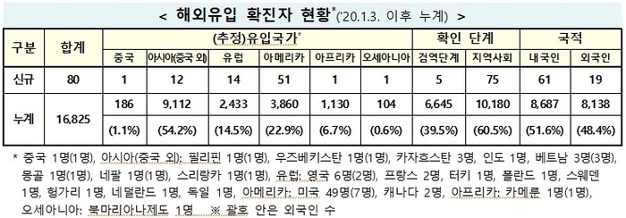 해외유입 확진자는 전날(75명)보다 5명이 더 늘어 80명을 기록했다. 사흘 연속 70명 이상을 보였다. 검역단계에서 5명이 확인됐고 지역사회에서 자가격리중 75명이 확진됐다. 국적별로는 내국인 61명, 외국인 19명이다.
