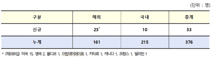 오미크론 변이 확진자는 하루 새 33명이 더 추가돼 누적 376명으로 늘었다. 33명 중 23명은 해외유입이고 10명은 국내감염이다. 해외유입 추정국은 8개국이며, 미국 15명을 비롯해 영국 2명, 몰디브·아랍에미리트·카타르·프랑스·필리핀 각 1명이다.