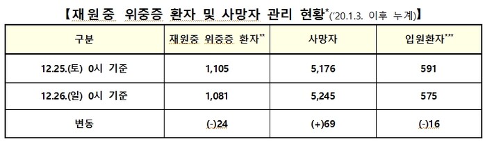 ▲ 26일 0시 기준 코로나19 재원중 위중증 환자 및 사망자 관리 현황. [중앙방역대책본부 제공] |