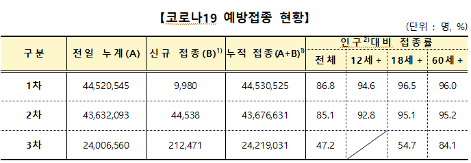 또, 2차 접종률은 85.1%(4367만6631명)이고, 1차 접종률은 86.8%이다.