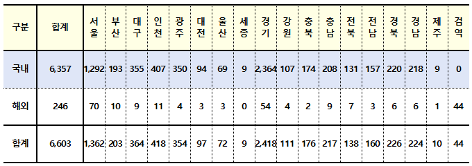 20일 0시 기준 신규 확진자 6603명 중 국내 지역발생 사례는 6357명, 해외유입 사례는 246명이다. 17개 광역지자체 시도에서 모두 지역발생 확진자가 나왔다.