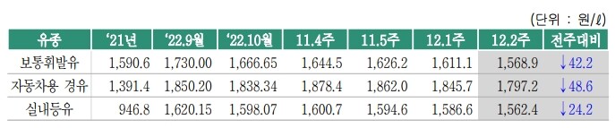 경유 판매가격은 11월 3주째(1888.8원) 이후 주간 단위로 4주 연속 내렸다.