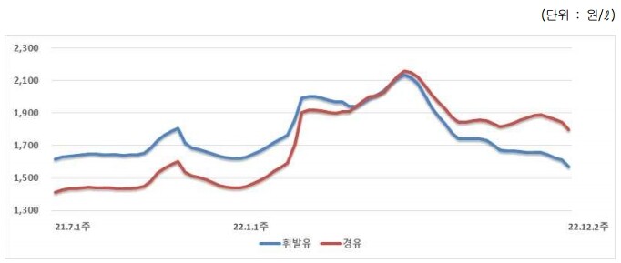 휘발유와 경유의 12월 2주째 주간 평균 리터당 판매가격은 올해 최고가를 기록했던 6월 5주째(휘발유 2137.7원, 경유 2158.2원)보다는 각각 568.8원, 361.0원 각각 하락했다. 경유 가격이 휘발유 가격보다 207.8원 덜 내린 셈이다.