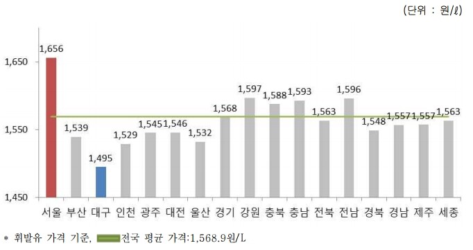 지역별 주유소 판매가격을 보면, 국내 최고가 지역인 서울의 이번 주 휘발유 평균 가격은 전주보다 43.5원 내린 리터당 1656.1원이었고, 최저가 지역인 대구는 50.2원 하락한 1494.6원으로 집계됐다.