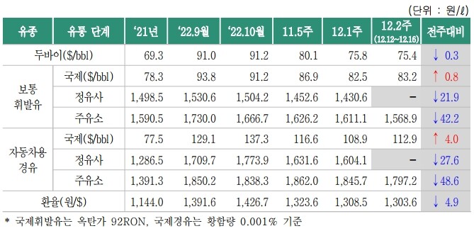 다만 국제 휘발유 평균 가격은 0.8달러 오른 배럴당 83.2달러, 국제 자동차용 경유 가격은 4.0달러 상승한 배럴당 112.9달러였다.