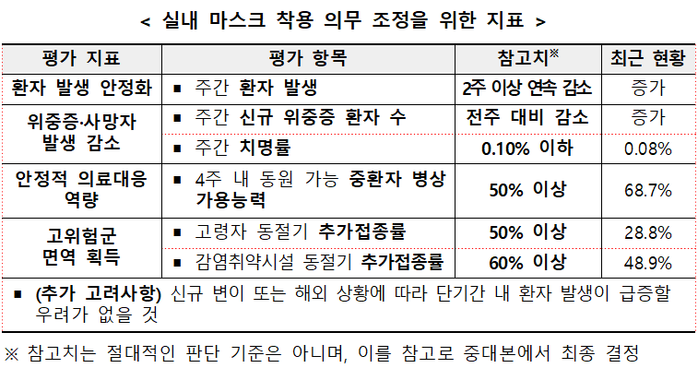 실내 마스크 착용 의무 조정 추진방안에 따르면, 1단계 의무 조정은 ▲ 환자 발생 안정화, ▲ 위중증·사망자 발생 감소, ▲ 안정적 의료대응 역량, ▲ 고위험군 면역 획득의 4개 지표 중 2개 이상이 충족될 때 중대본 논의를 거쳐 시행할 예정이다.