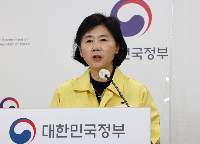 ▲ 지영미 질병관리청장(중앙방역대책본부장)이 23일 오전 충북 청주시 질병관리청에서 열린 코로나19 대응 정례브리핑에서 실내마스크 의무화 조정계획 등을 발표하고 있다. [청주=연합뉴스] |