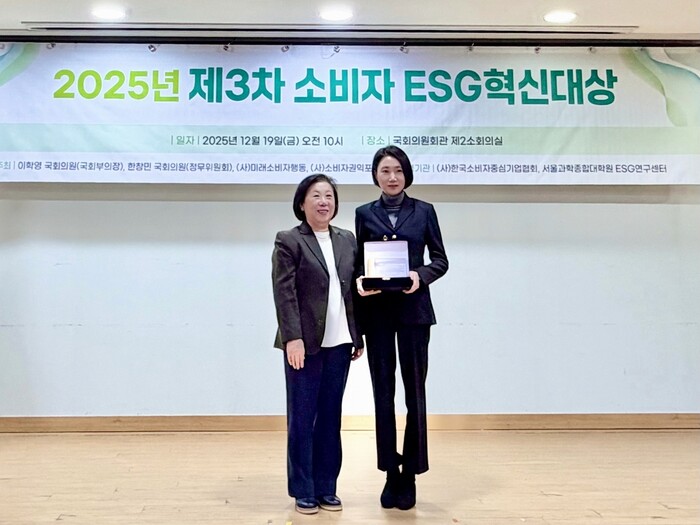 ‘2025 소비자 ESG 혁신대상’은 ESG 소비자 이니셔티브가 주관하고 미래소비자행동, 소비자 권익포럼이 공동 주최하는 행사다. 올해는 전문가 평가와 소비자 평가단 50명의 심사를 거쳐 총 24개 기업이 ESG 경영 우수 사례로 선정됐다.
