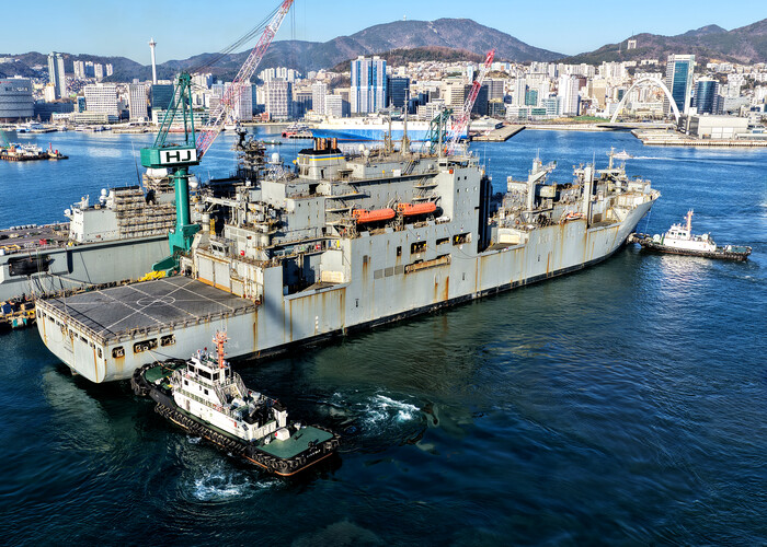 | ▲지난 12일 정비를 받기 위해 HJ중공업 영도조선소에 입항한 미 해군 군수지원함 '아멜리아 에어하트호'[사진=HJ중공업] |