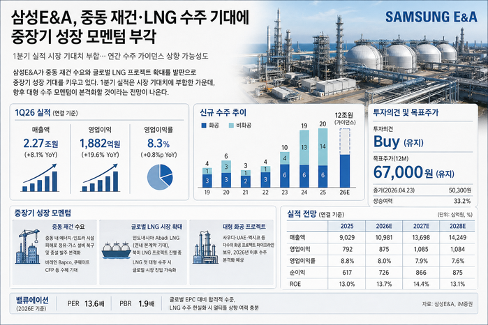 IM증권 관계자는 "삼성E&A는 중동 재건, LNG, 친환경 에너지 전환이라는 글로벌 메가트렌드의 최대 수혜주"라며 "단기 실적의 안정성에 더해 중장기 성장 모멘텀까지 갖추고 있어 매수 관점에서 접근이 유효하다"고 말했다.